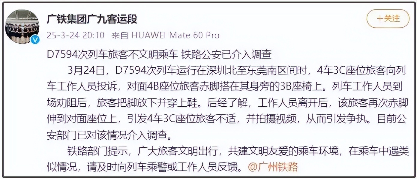 3月24日晚,广铁集团广九客运段发布“D7594次列车旅客不文明乘车”的情况说明,表示目前铁路公安已介入调查。