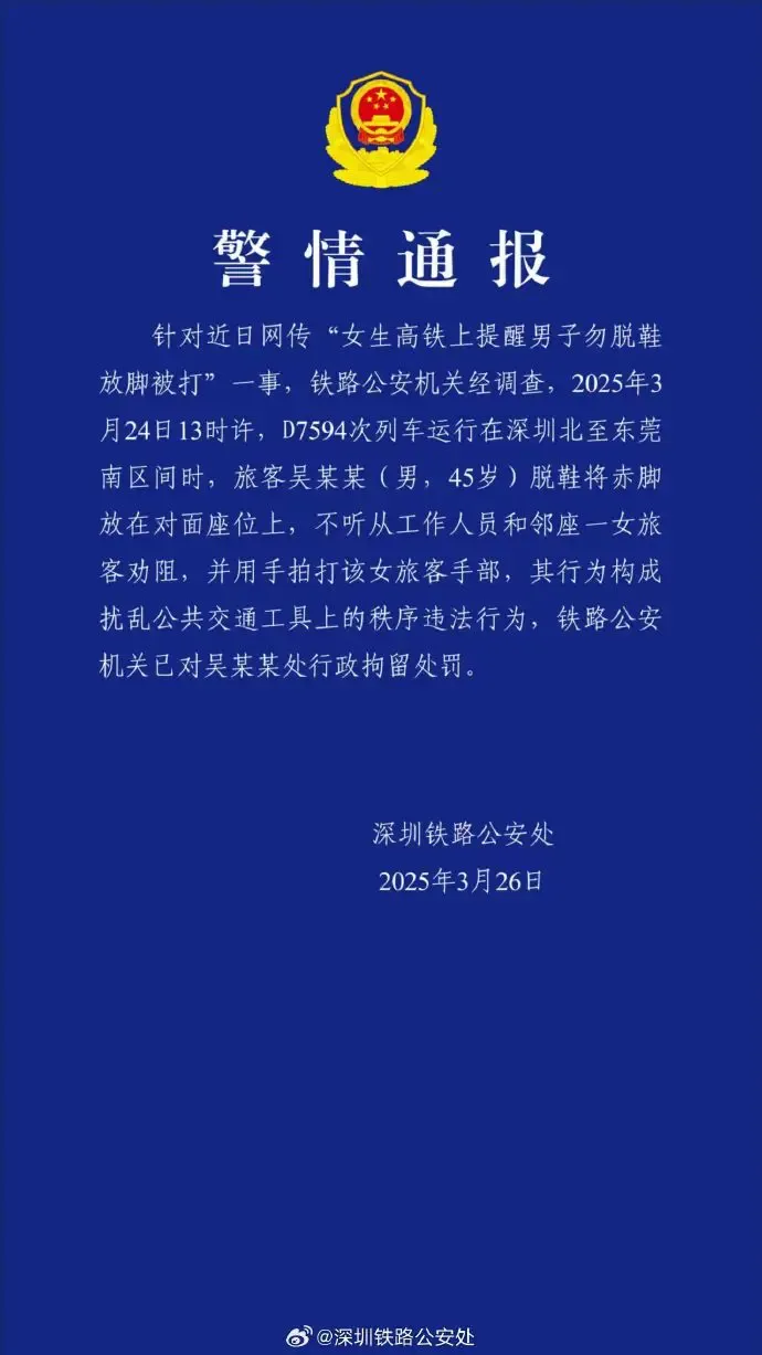 针对近日网传“女生高铁上提醒男子勿脱鞋放脚被打”一事,铁路公安机关经调查,2025年3月24日13时许,D7594次列车运行在深圳北至东莞南区间时,旅客吴某某(男,45岁)脱鞋将赤脚放在对面座位上,不听从工作人员和邻座一女旅客劝阻,并用手拍打该女旅客手部,其行为构成扰乱公共交通工具上的秩序违法行为,铁路公安机关已对吴某某处行政拘留处罚。